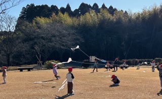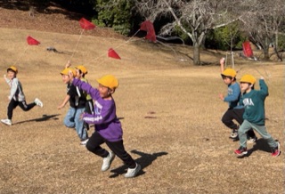 もも・さくら・すみれ組は園庭、ばら・ゆり組は園バスに乗って法華岳公園に行きたこあげをしました。風もなく穏やかな日で、子ども達は一生懸命走って凧を揚げていましたよ!